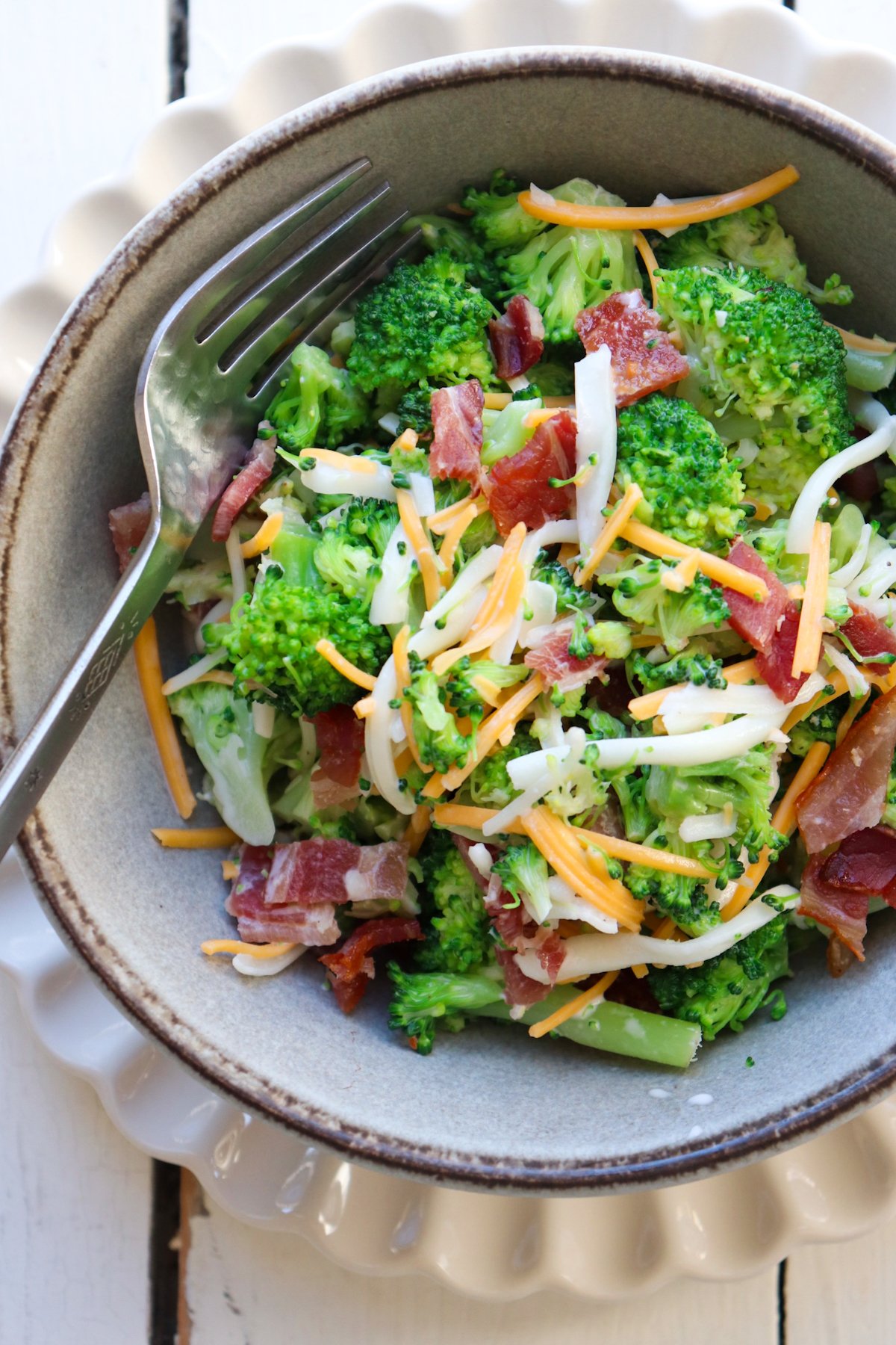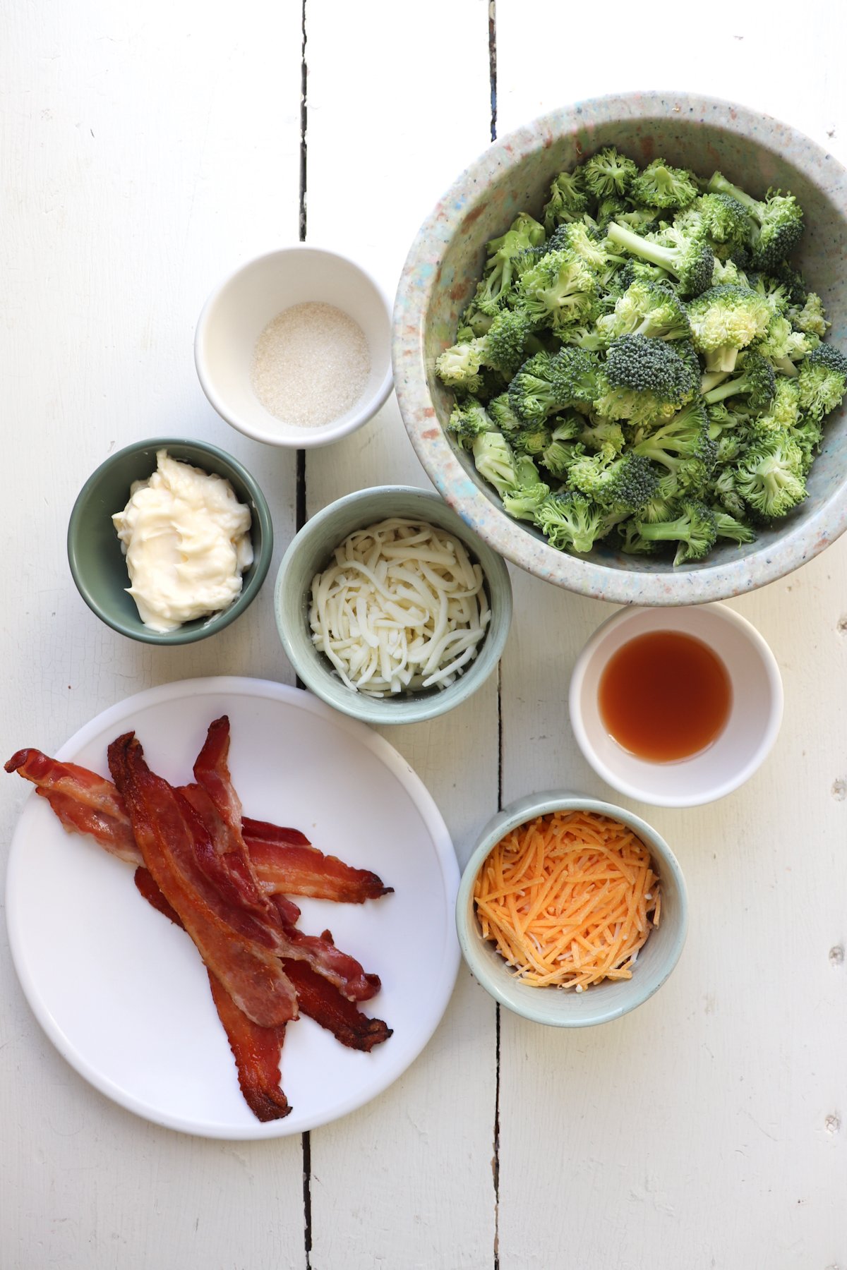 - Add blanched broccoli pieces, crumbled bacon, and shredded cheese. Stir to combine. Refrigerate for 30 minutes before serving.