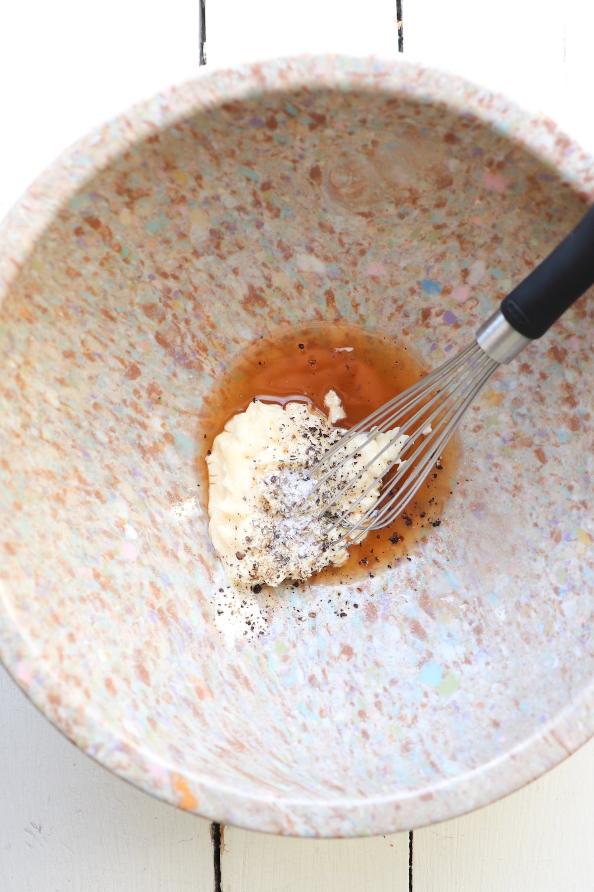 - Add mayonnaise, salt, and pepper. Whisk to combine.