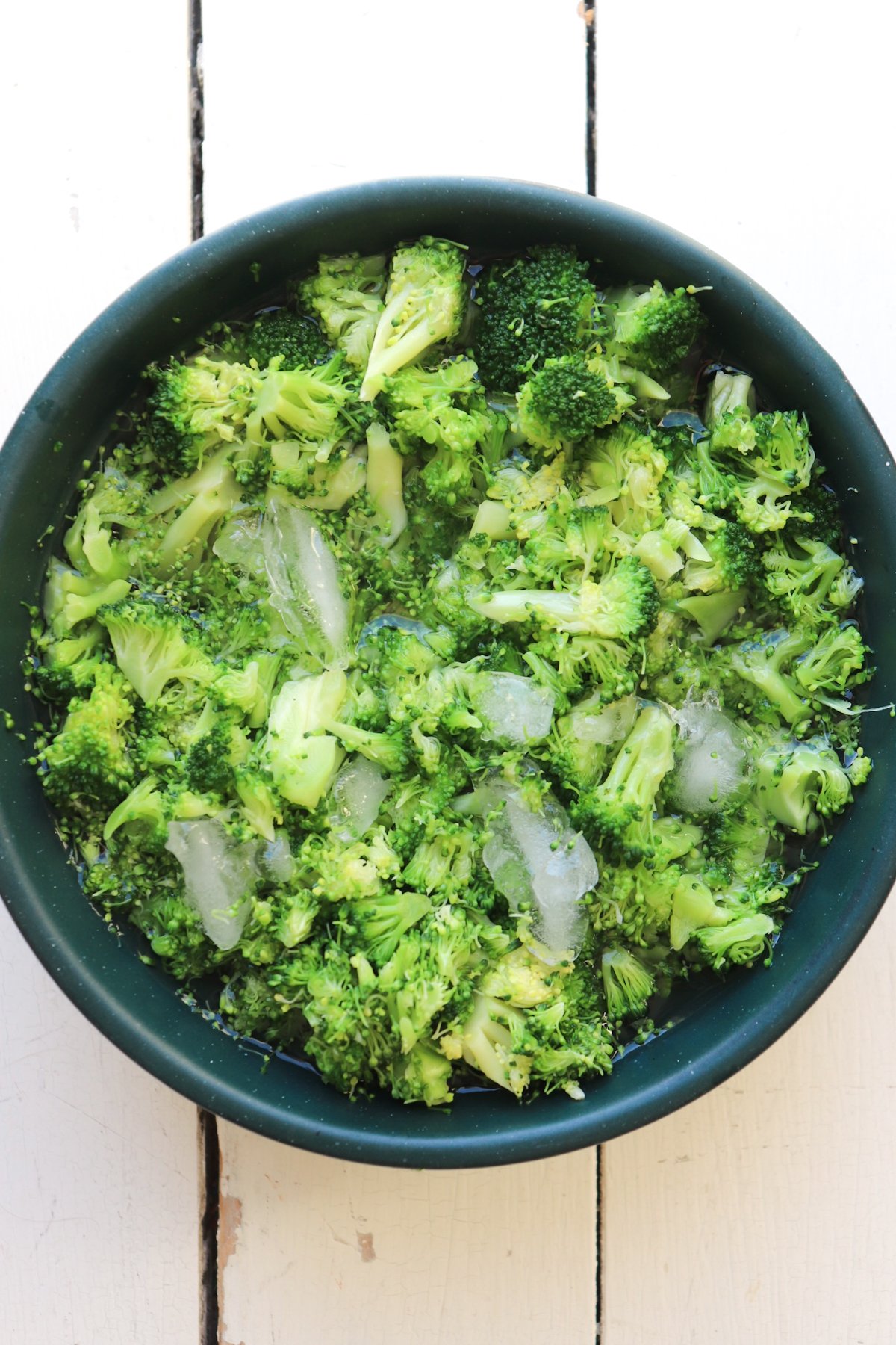 - Once the 1 minute is up, immediately, using a slotted spoon, remove the broccoli and place in a large bowl filled with ice water to shock it and stop the broccoli from cooking any more. Use a slotted spoon to remove broccoli to a paper towel lined bowl to the side to help remove excess water.