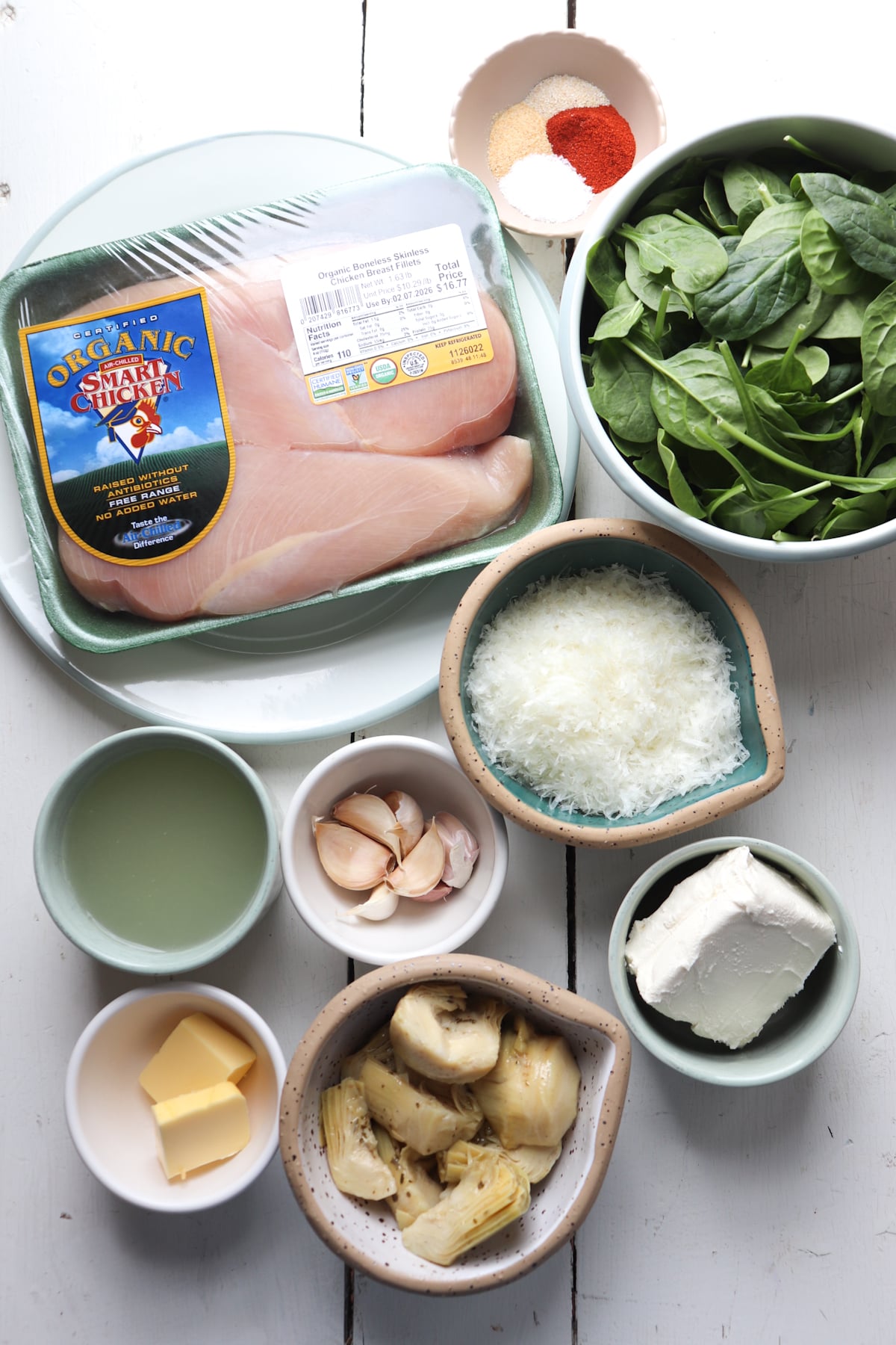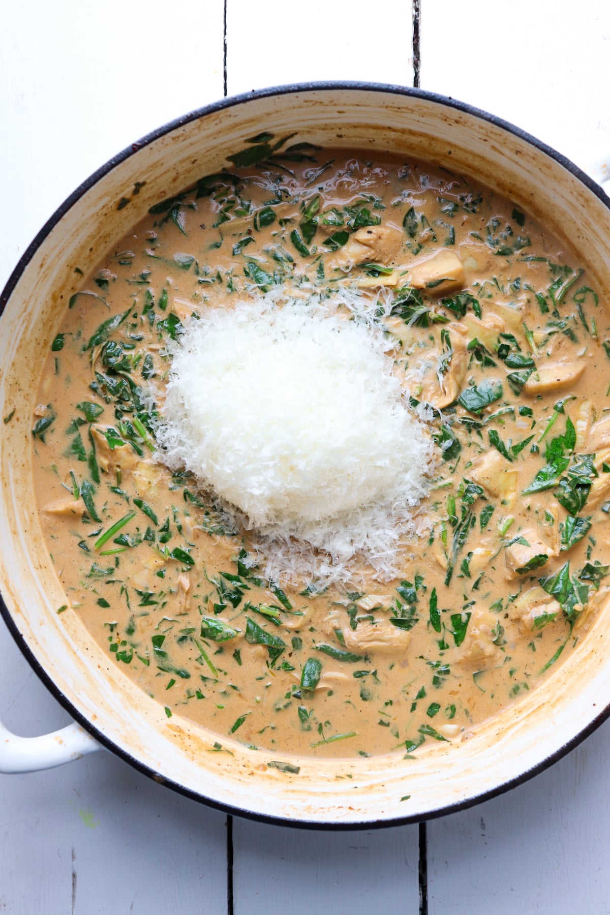 I wanted to find a way to implement those flavors into a protein rich main dish and the result is this creamy chicken dish that is decadent and rich with lots of silky spinach and tangy artichoke pieces. Oh, and a cream cheese sauce loaded with salty parmesan cheese.