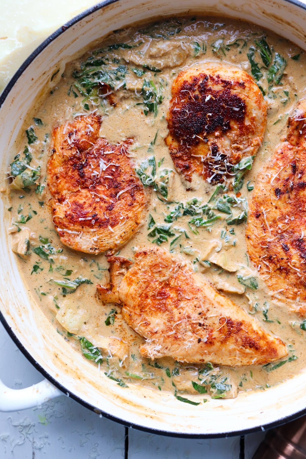 Creamy Spinach Artichoke Chicken features seasoned chicken breasts pan seared until golden brown and nestled in a creamy spinach artichoke sauce. Enjoy this one on its own or alongside pasta, mashed potatoes or rice.