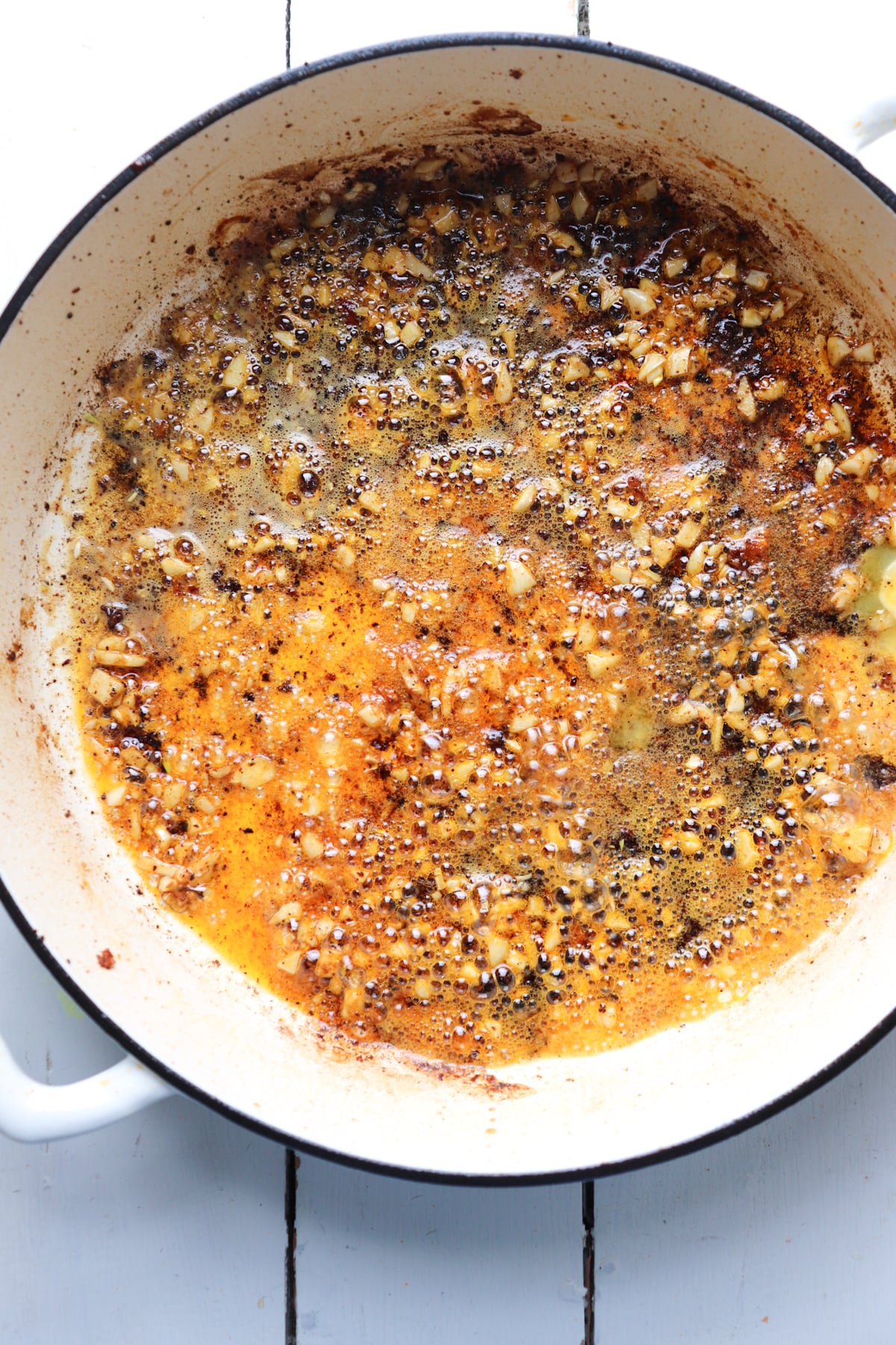 - To the same skillet, melt butter and add minced garlic. Cook for 1-2 minutes until fragrant but do not allow to brown.