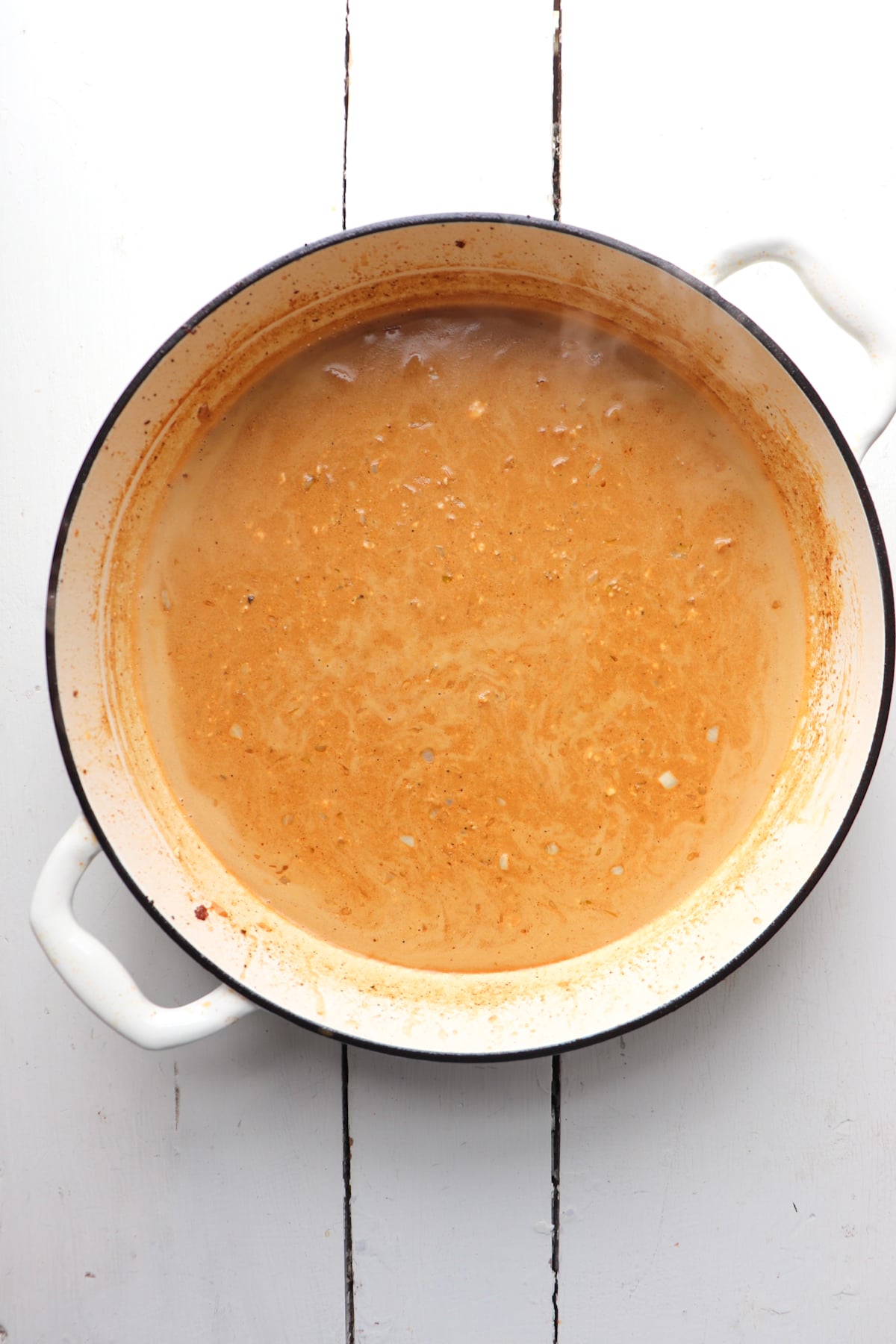 Step 6. Reduce heat to medium low and whisk in softened cream cheese. Allow to reduce, about 5 minutes, stirring occasionally.