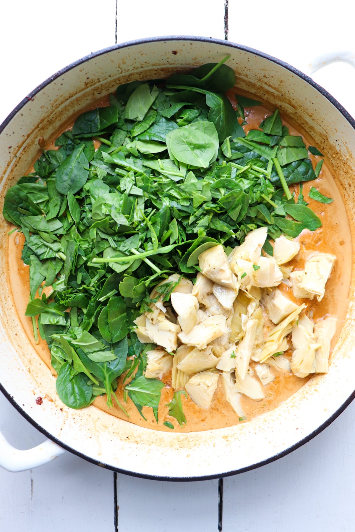 - Add chopped spinach and chopped artichoke hearts and allow to cook for 1-2 minutes.