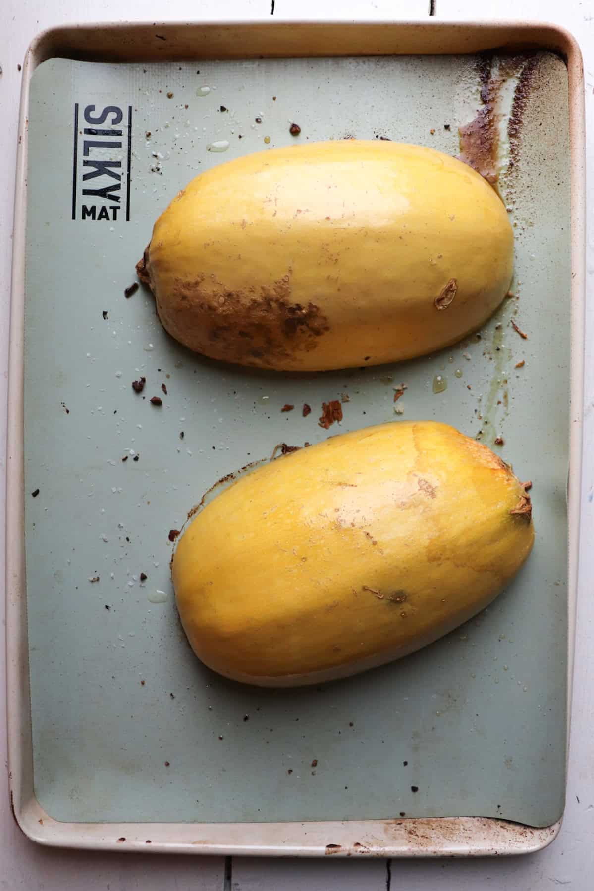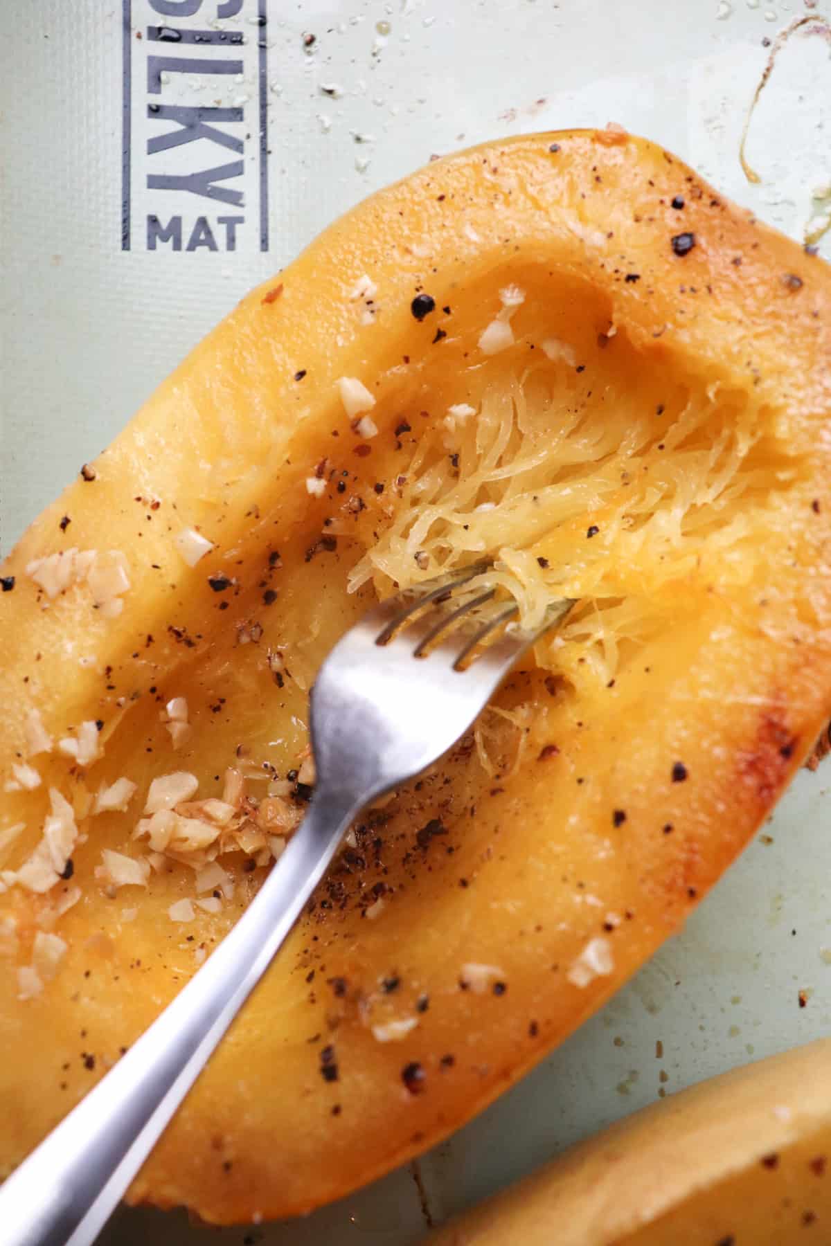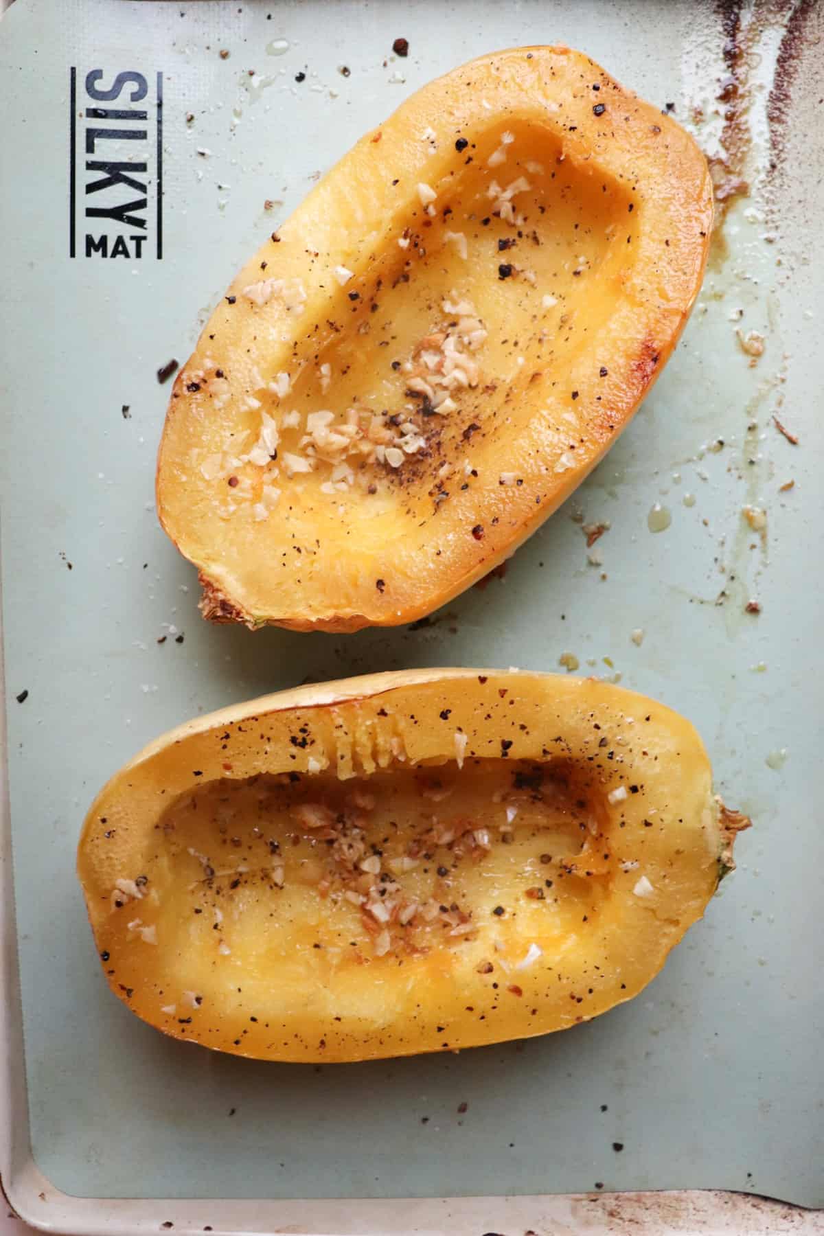 - You can roast spaghetti squash facing either up or down. Both work, but because you’re putting fresh minced garlic, I prefer to turn them upside down with the skin up. This prevents the garlic from burning at the high heat.