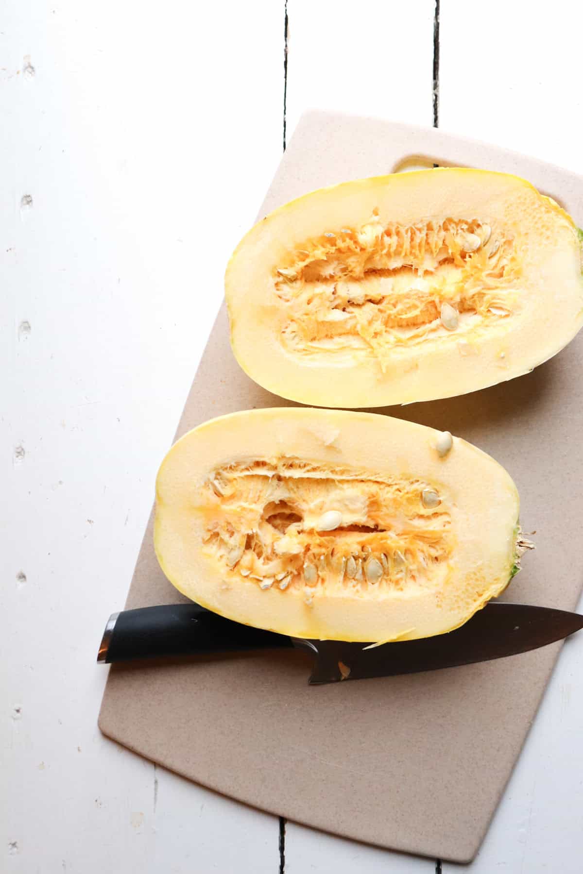 - Using a sharp knife, carefully slice spaghetti squash in half lengthwise.