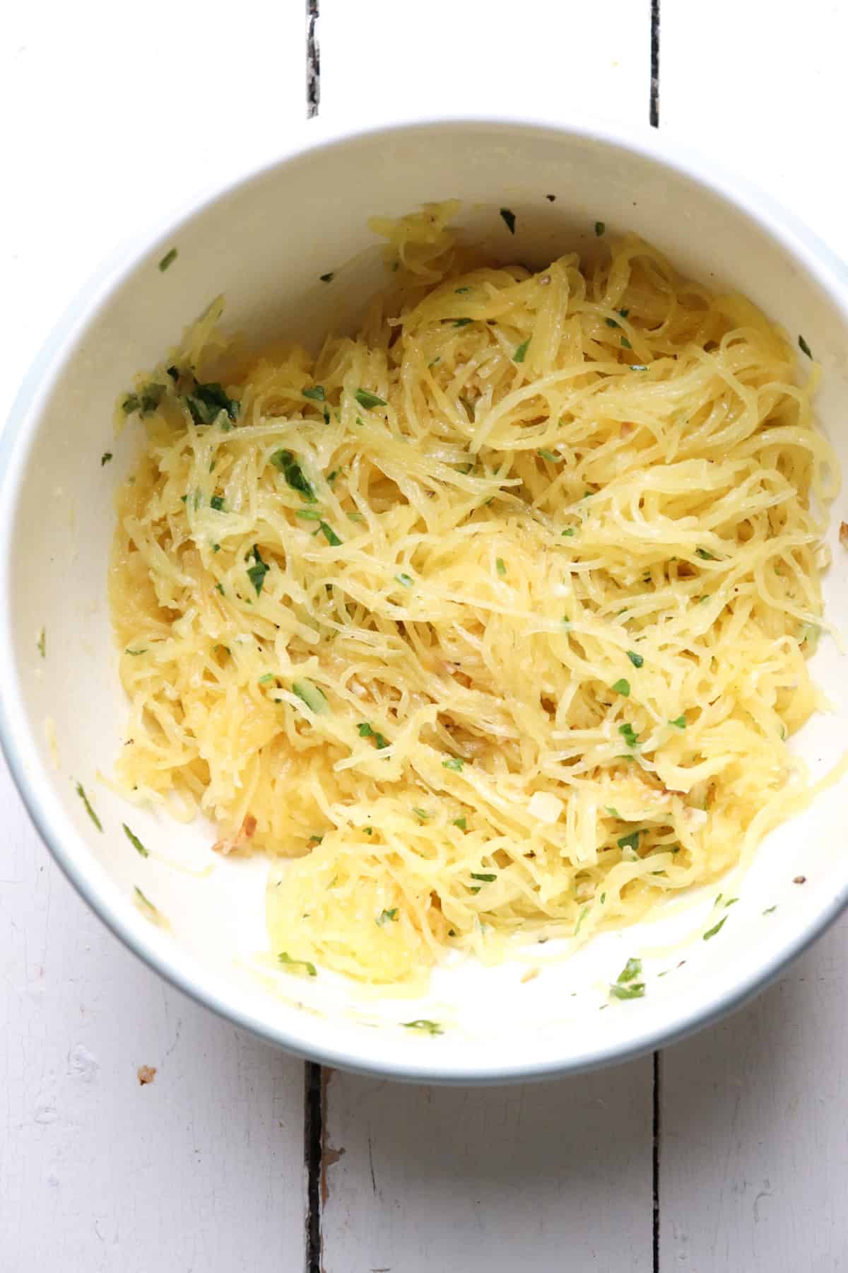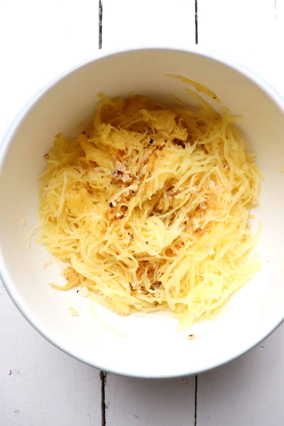 While you could enjoy spaghetti squash plain, seasoning it with garlic and parmesan is such a simple way to add robust flavor.