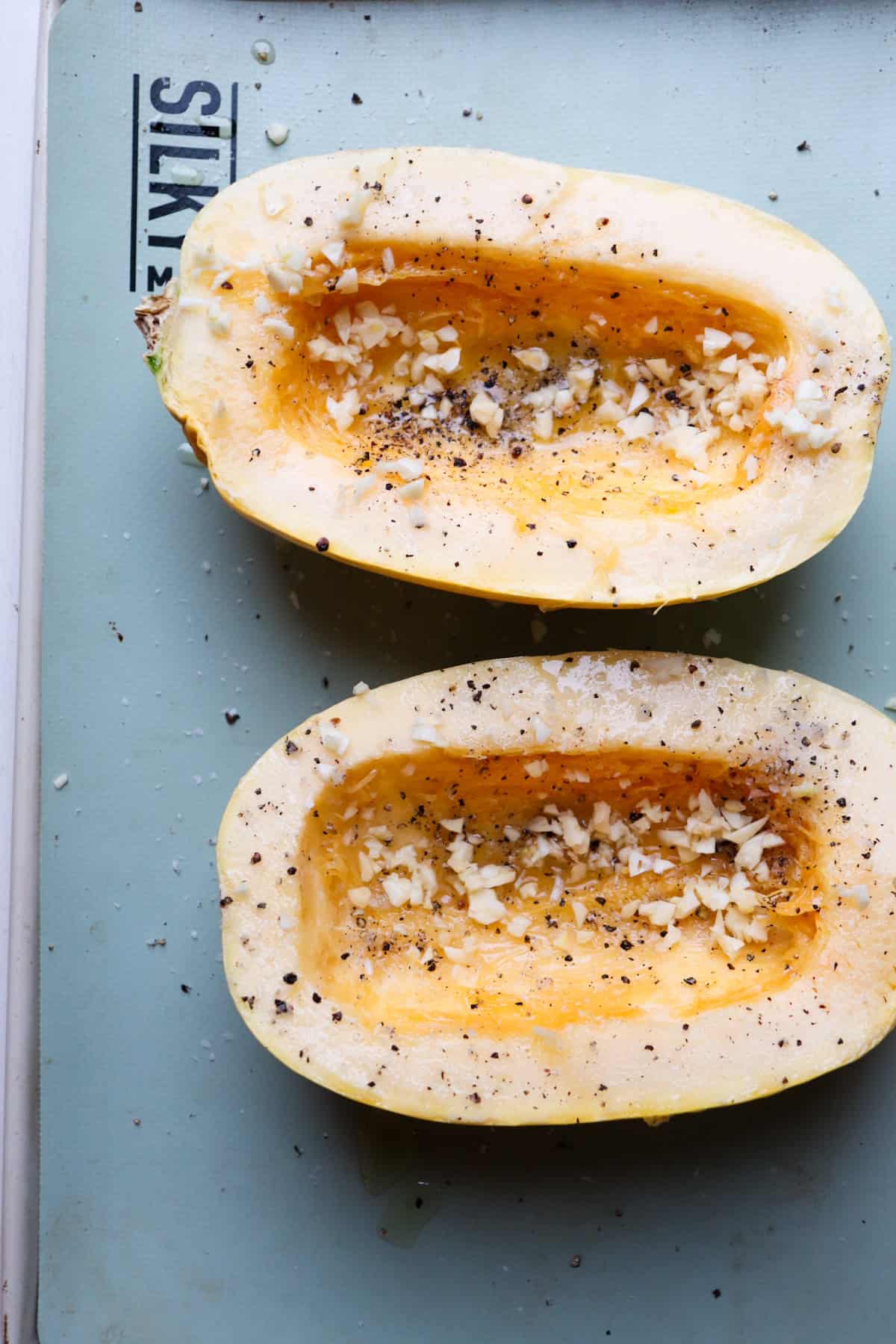 - Drizzle olive oil onto the flesh of the spaghetti squash, along with minced garlic, salt, and pepper.
