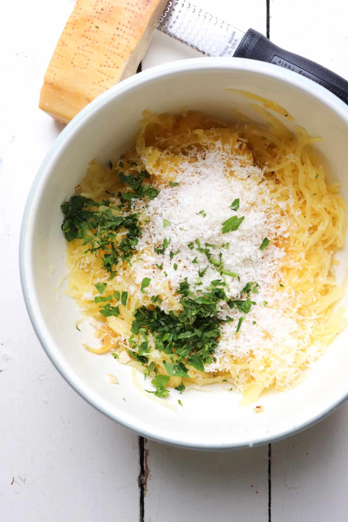- Place hot spaghetti strands in a mixing bowl and add freshly grated parmesan and chopped fresh parsley.