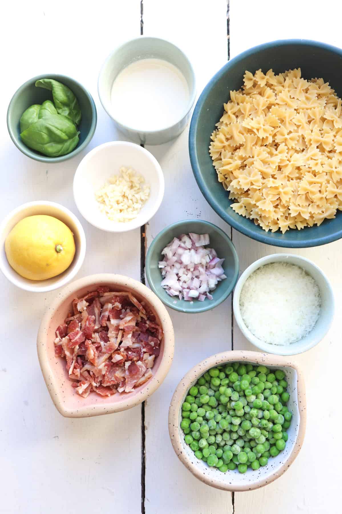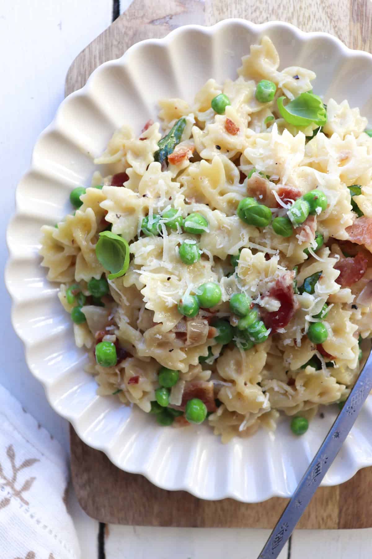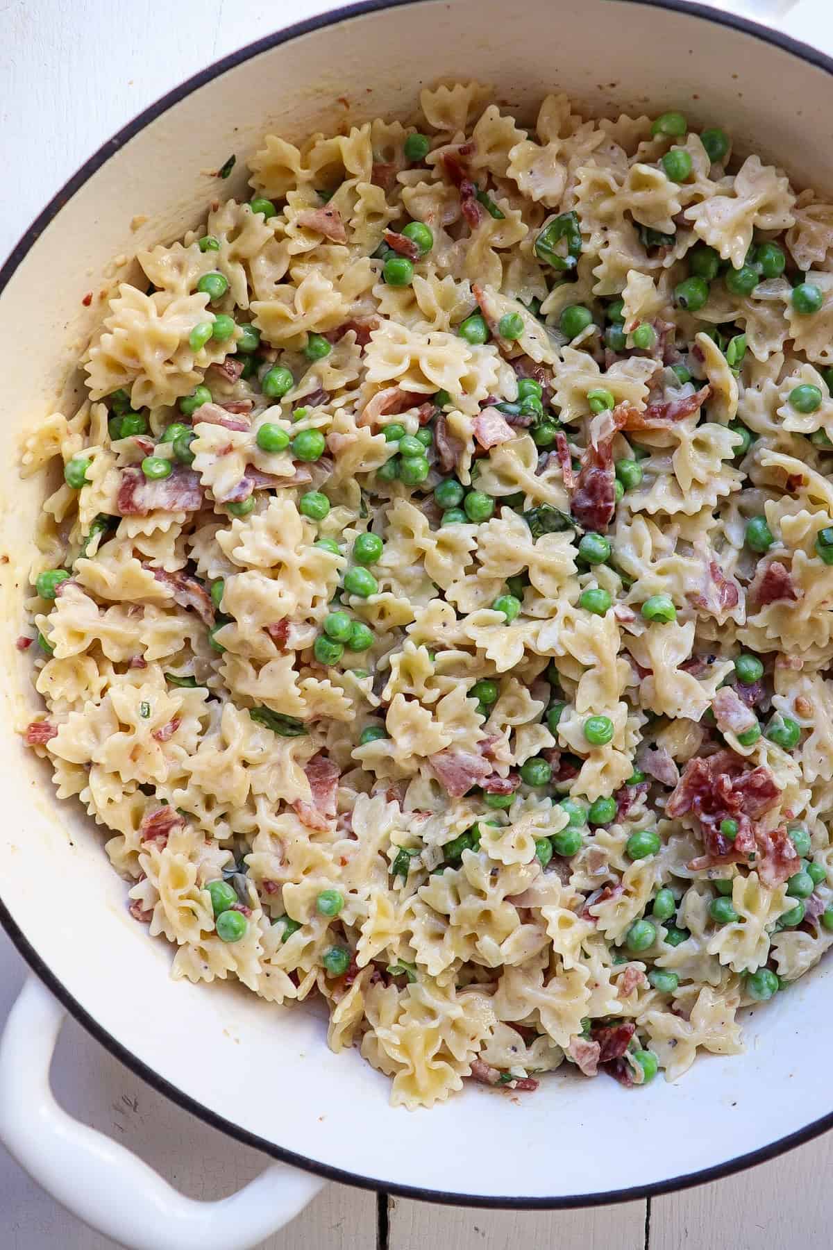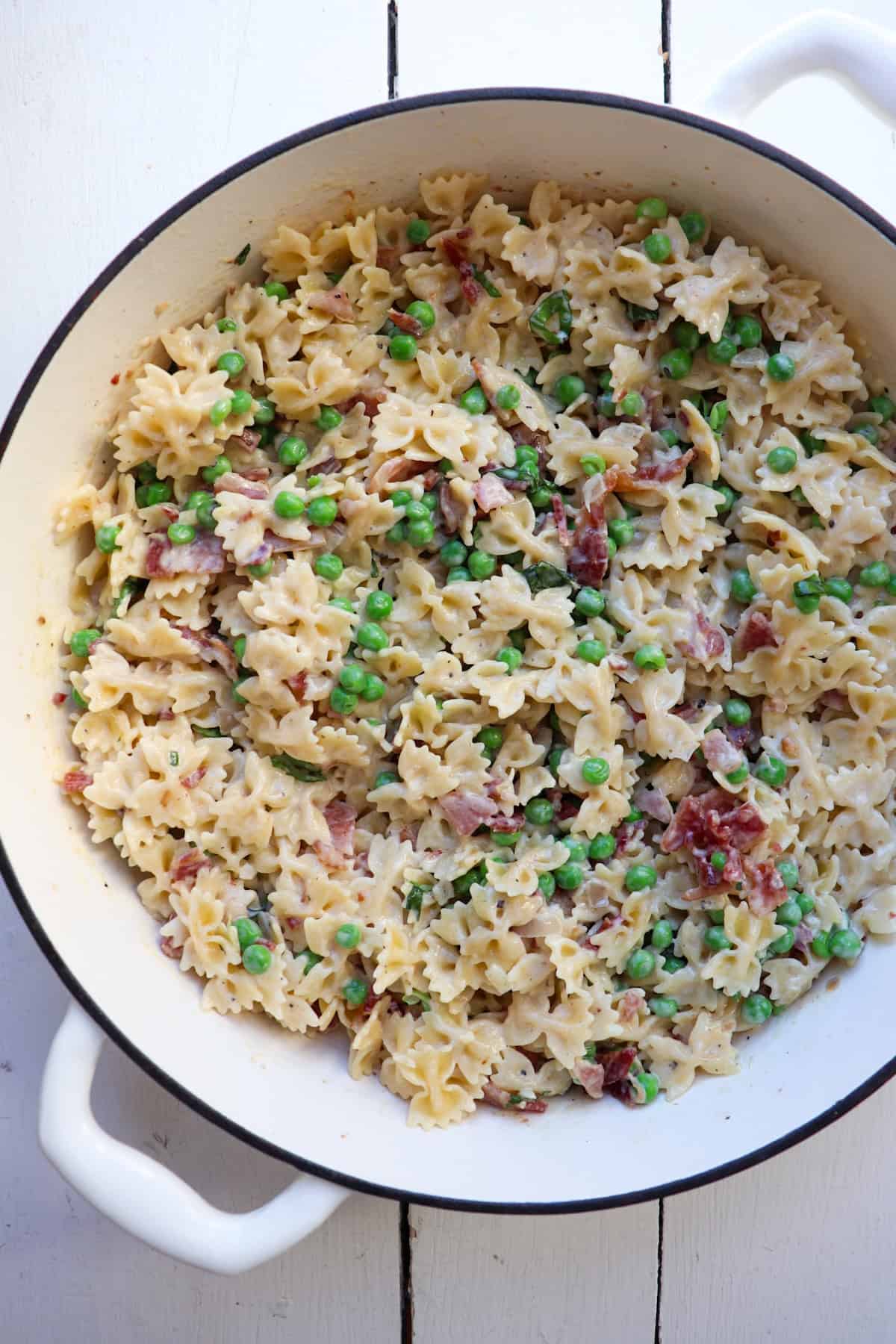 - Peas: Seasonal produce is a great addition to pasta dishes, and that's what shines in this bacon pea pasta. I used frozen peas, but if you can get your hands on fresh, go for it!