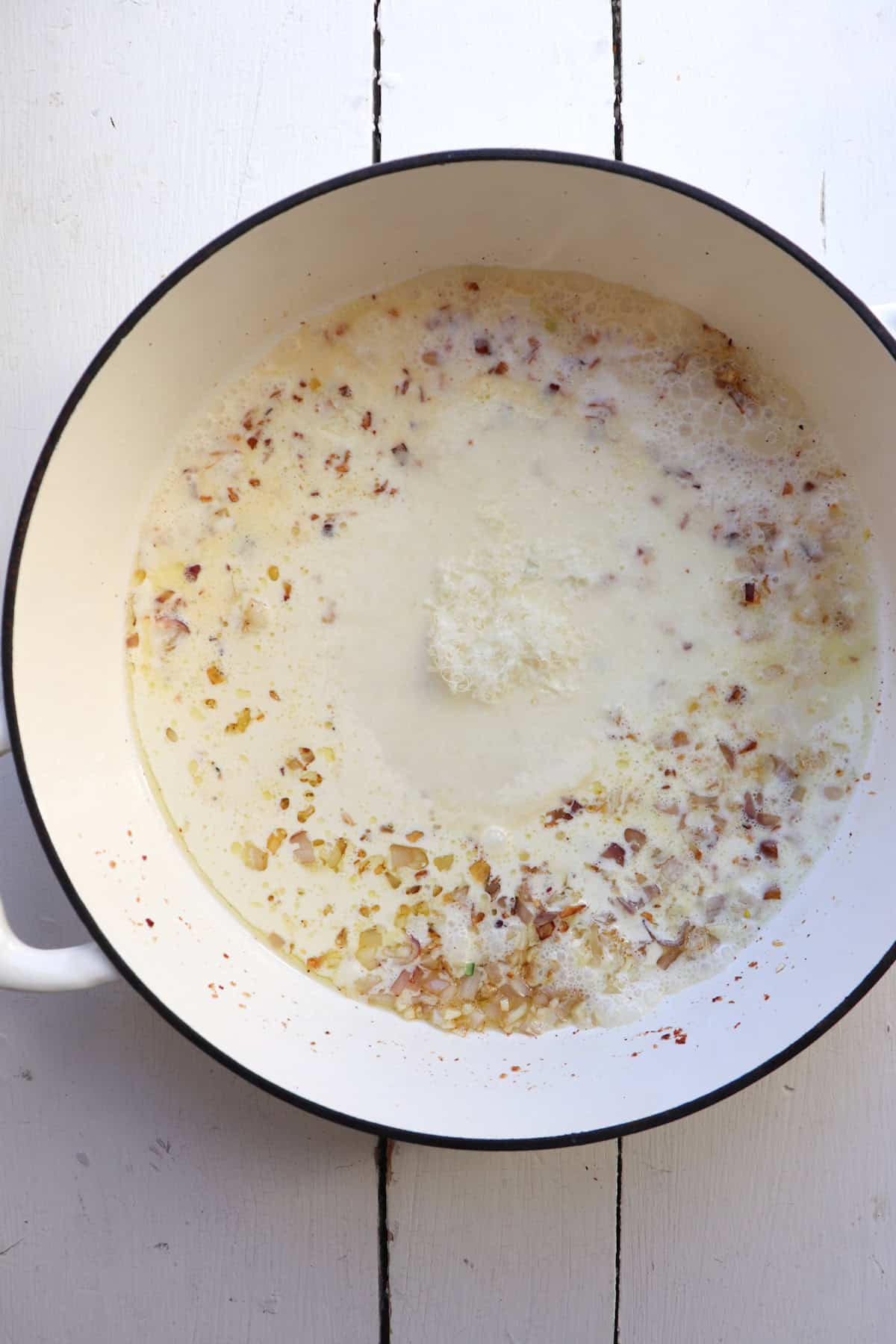 Step 3. Deglaze pan with reserved pasta water and add heavy cream and parmesan cheese.