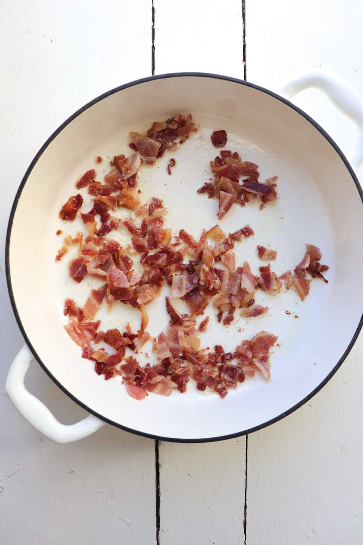 - Cook bacon until crispy and remove with a slotted spoon to a plate to the side.