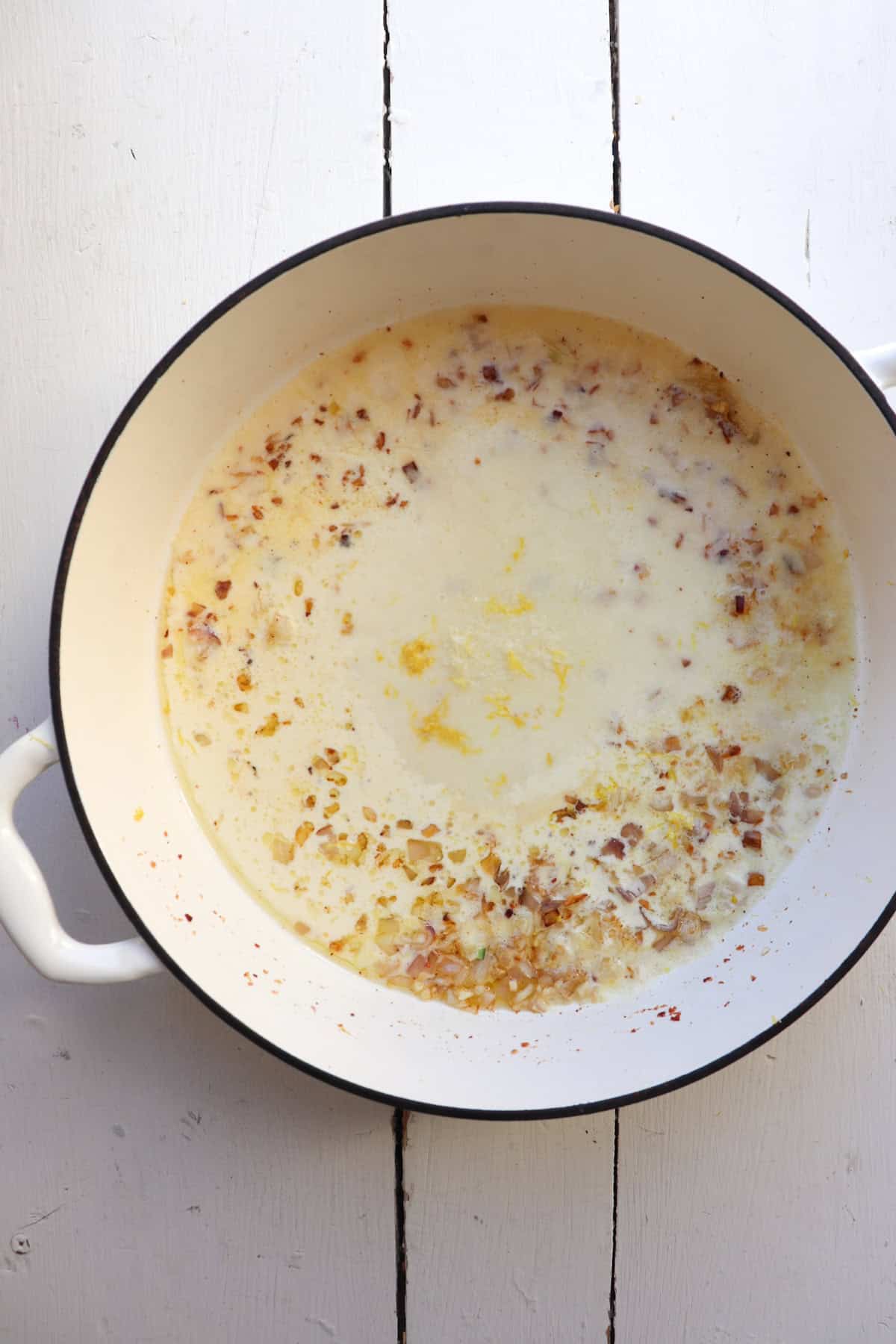 Step 4. Reduce to thicken for 3-4 minutes. Add lemon zest, salt, and pepper.