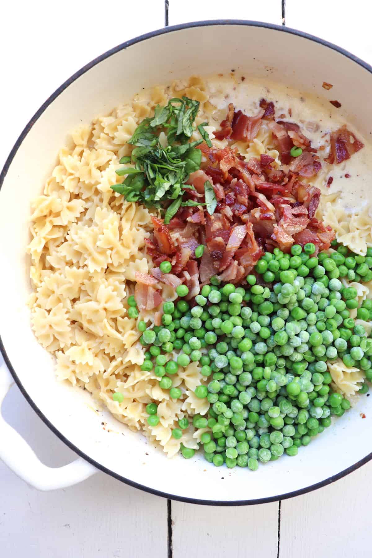 - Add bacon in bacon, cooked pasta, frozen peas, and chopped basil.
