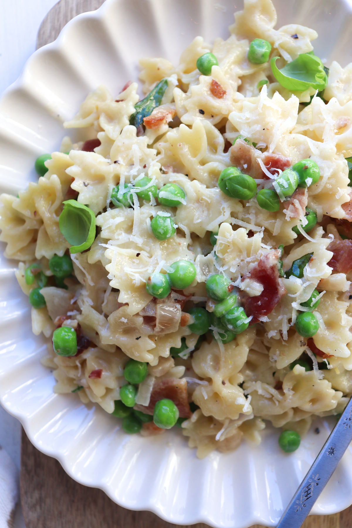 - Peas: Seasonal produce is a great addition to pasta dishes, and that's what shines in this bacon pea pasta. I used frozen peas, but if you can get your hands on fresh, go for it!