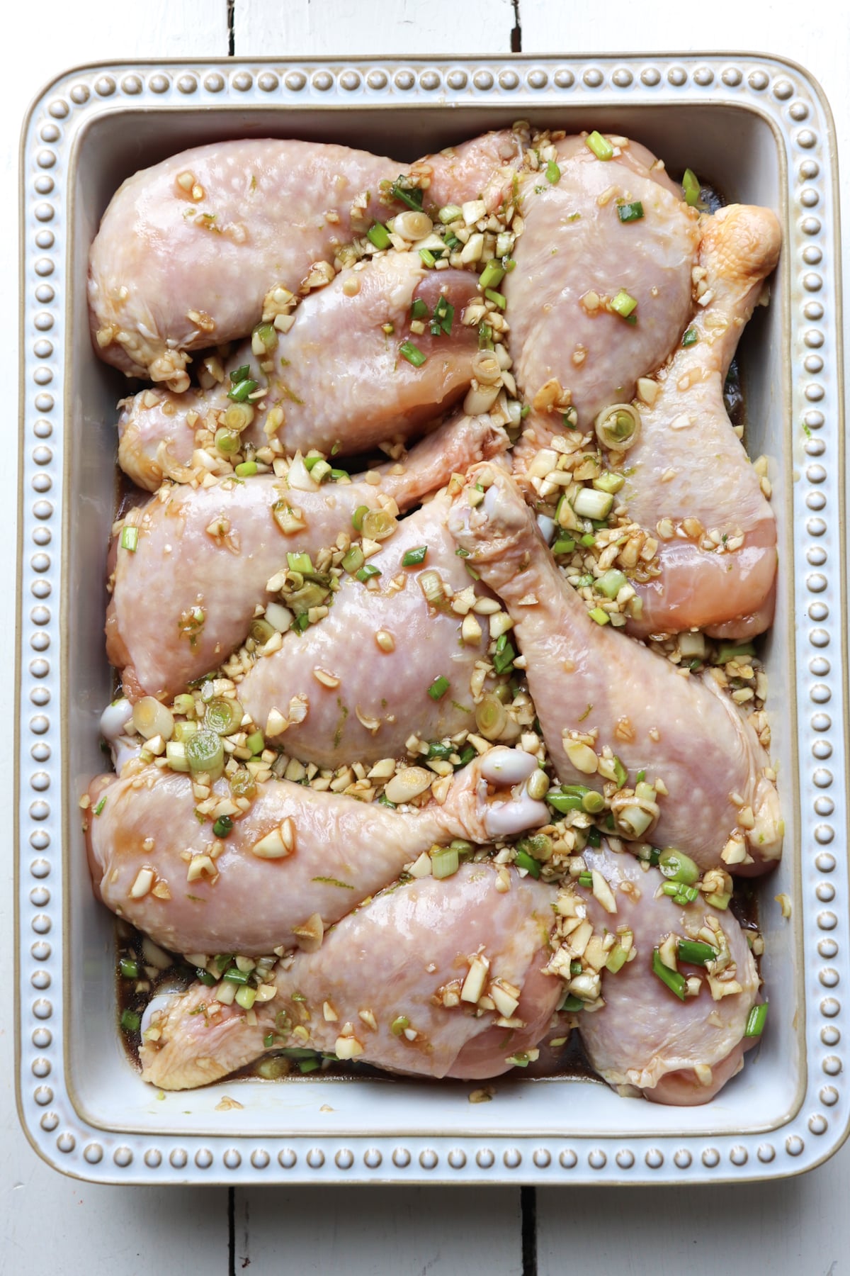 - When you are ready to cook, preheat oven to 400 F. Place chicken drumsticks into a baking dish along with any remaining marinade.