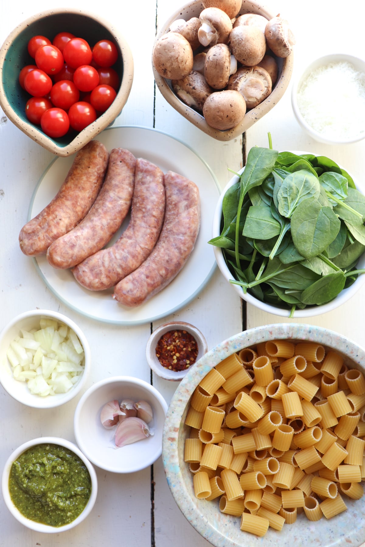 This simple Sausage and Mushroom Pasta makes a perfect weeknight dinner. Not only is it completely full of flavor from pesto, spicy Italian sausage, earthy mushrooms and ripe cherry tomatoes-- it requires only a few dishes and minimal clean-up.