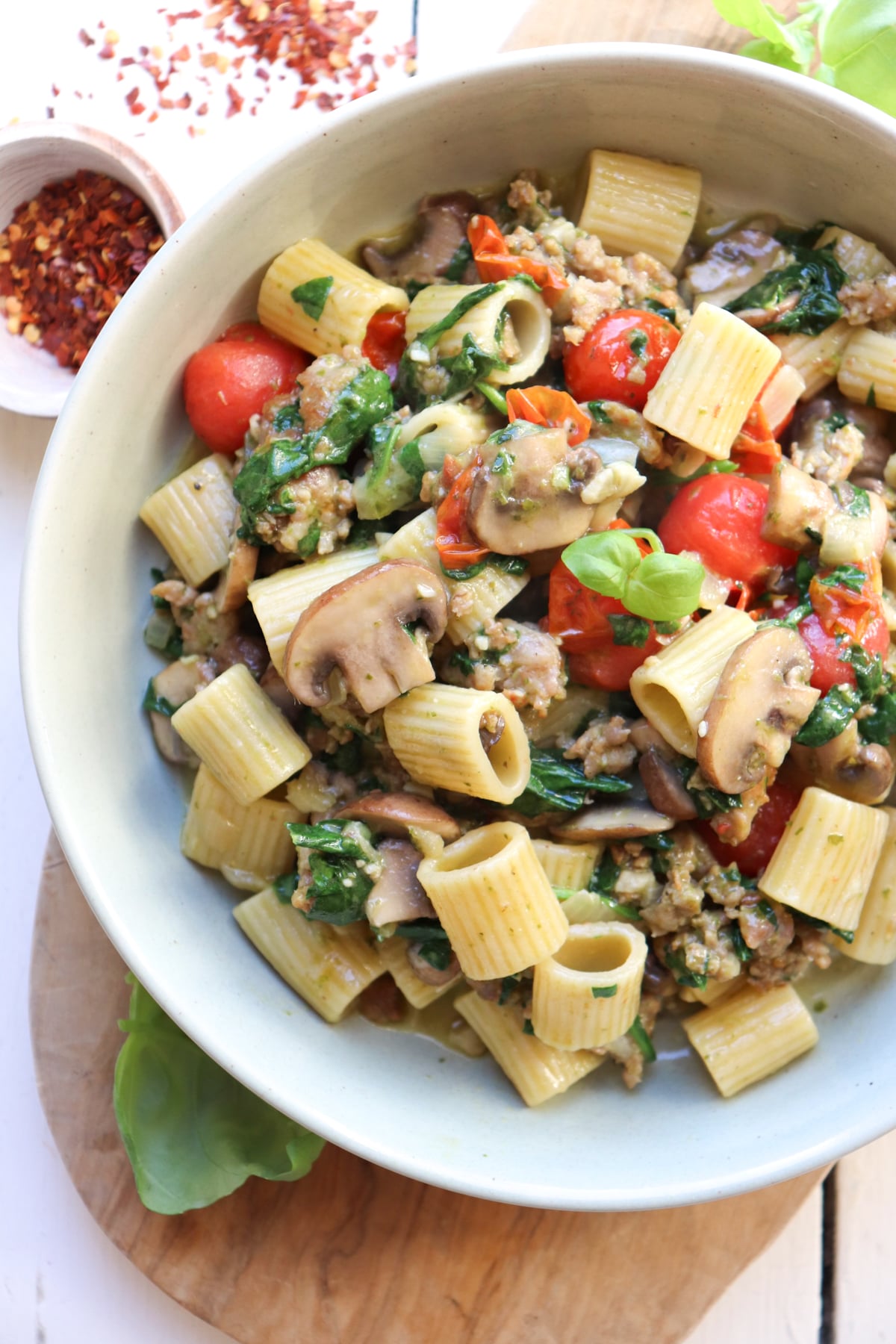 This simple Sausage and Mushroom Pasta makes a perfect weeknight dinner. Not only is it completely full of flavor from pesto, spicy Italian sausage, earthy mushrooms and ripe cherry tomatoes-- it requires only a few dishes and minimal clean-up.