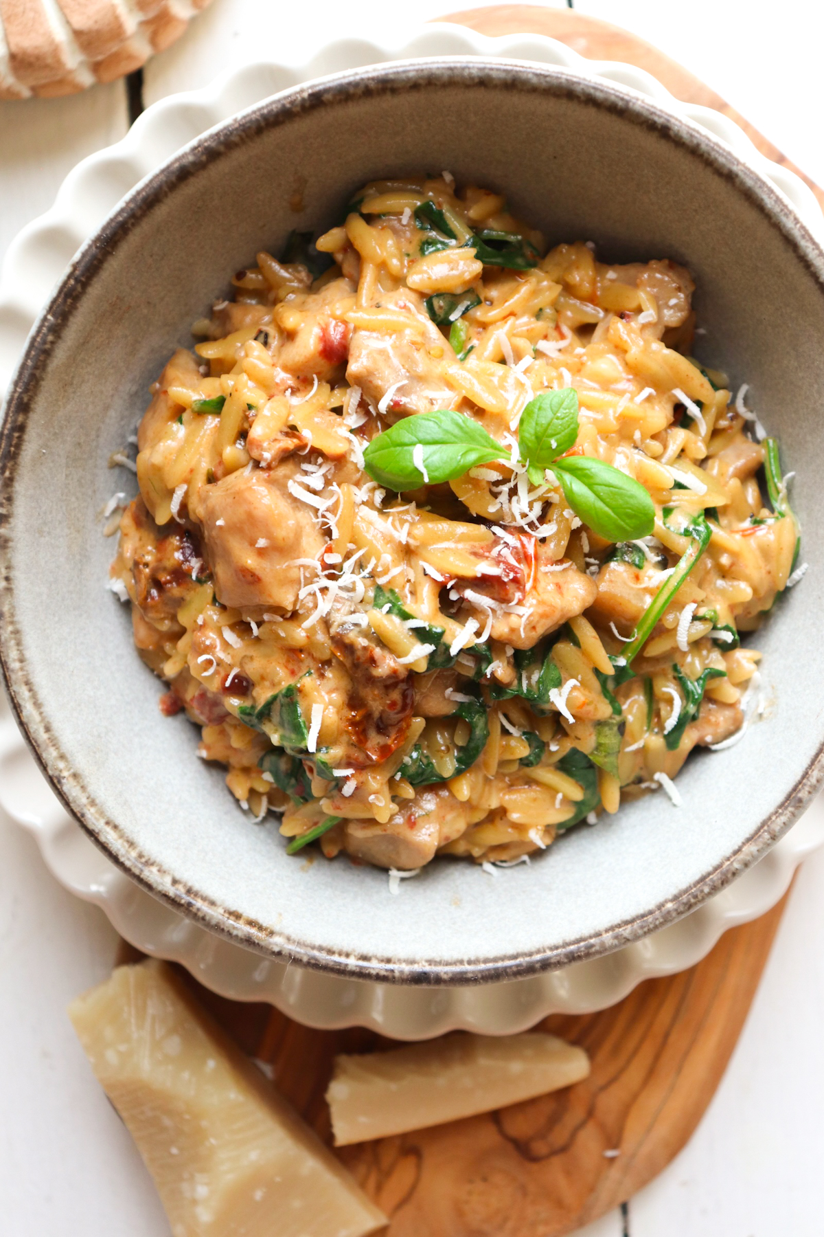 Now, I'm not promising any marriage proposals, but this marry me chicken orzo is really quite something. The original dish has tender chicken breasts in a cream sauce with sundried tomatoes and garlic. This version reimagines that dish into a full meal with pasta and veggies included.
