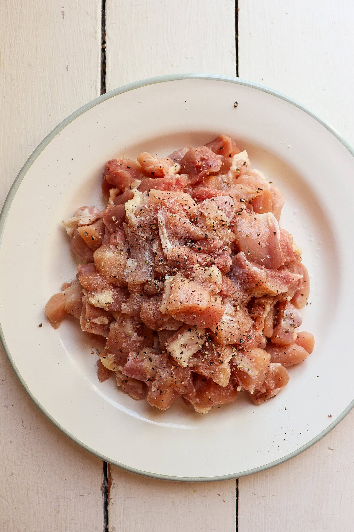 Step 1. Begin by preparing your chicken. Cut it into bite-sized pieces (about 1 inch). Season liberally with salt and pepper and set to the side.