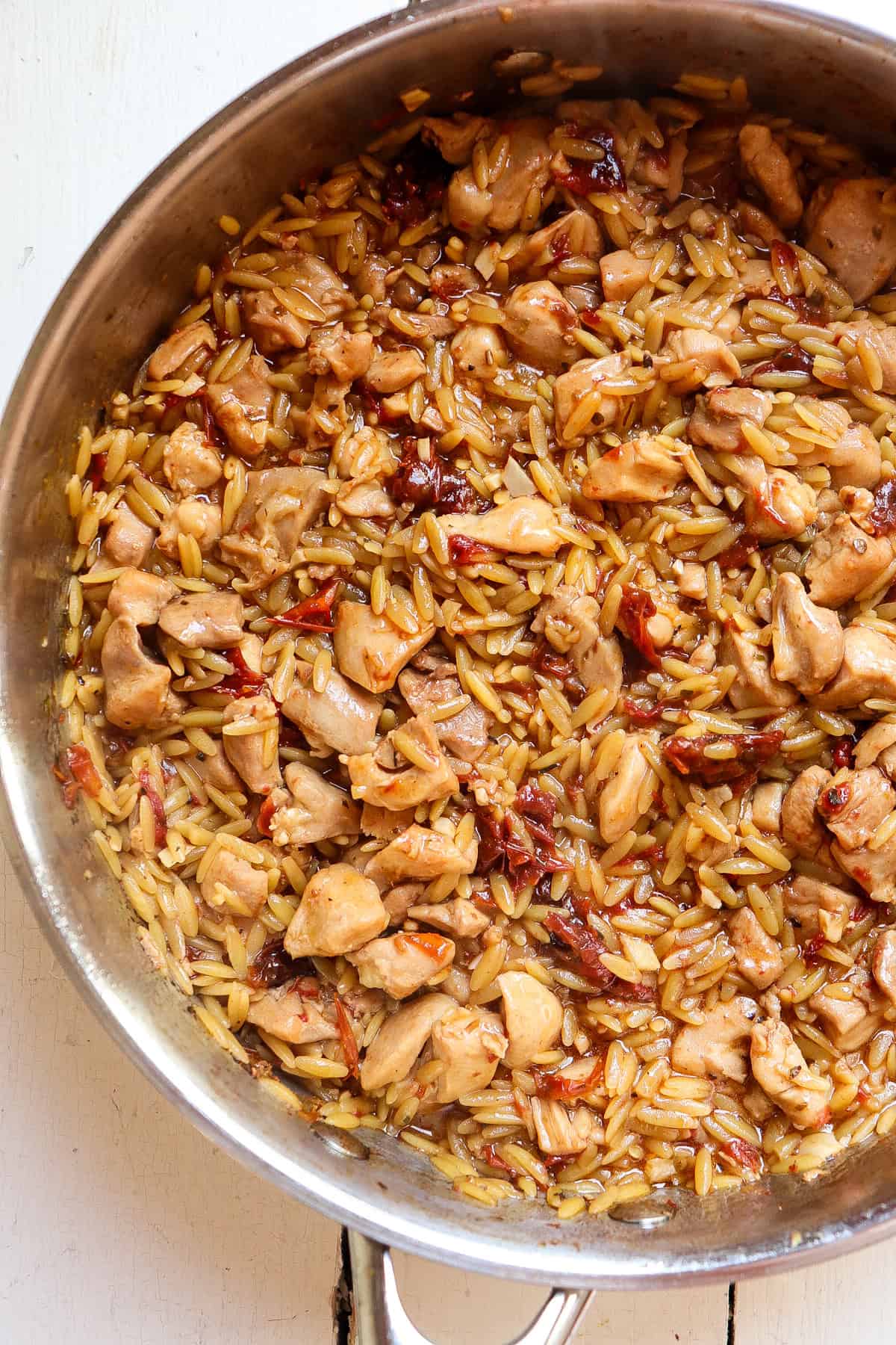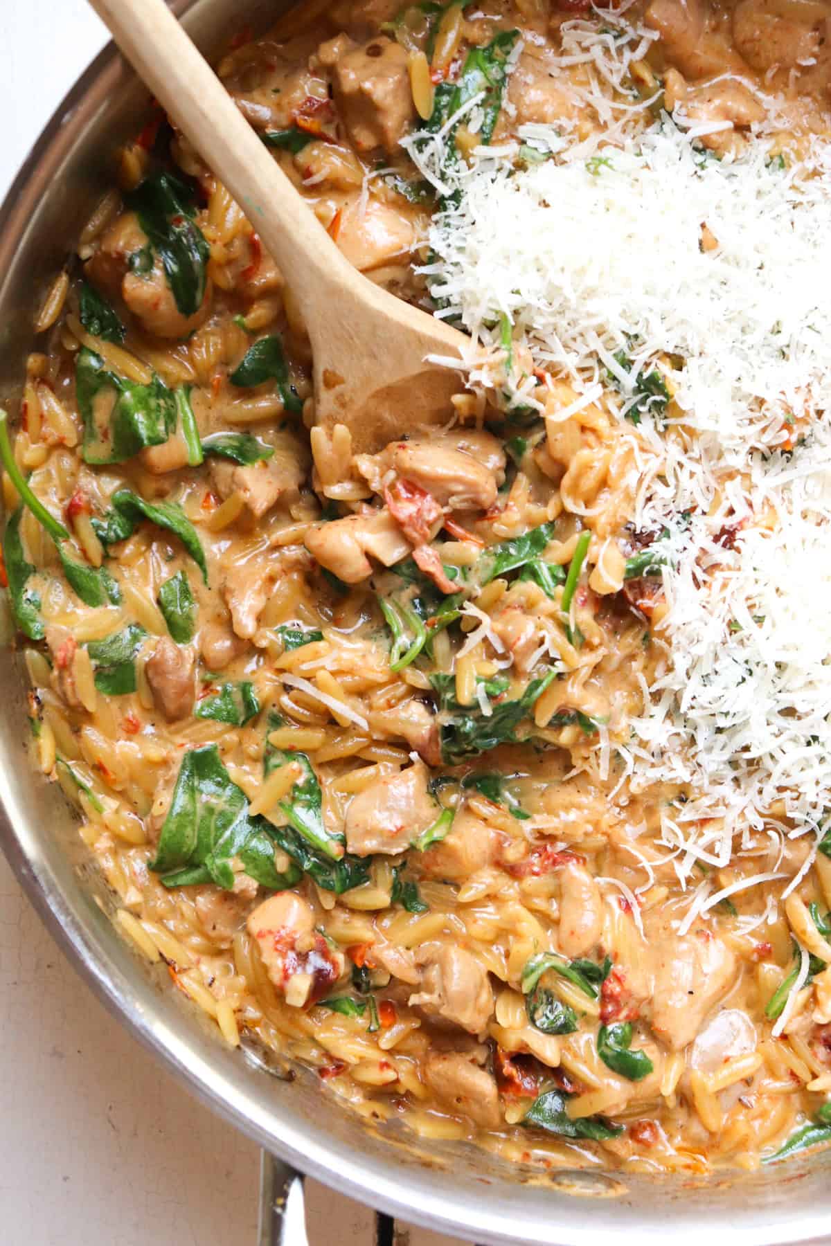 Now, I'm not promising any marriage proposals, but this marry me chicken orzo is really quite something. The original dish has tender chicken breasts in a cream sauce with sundried tomatoes and garlic. This version reimagines that dish into a full meal with pasta and veggies included.