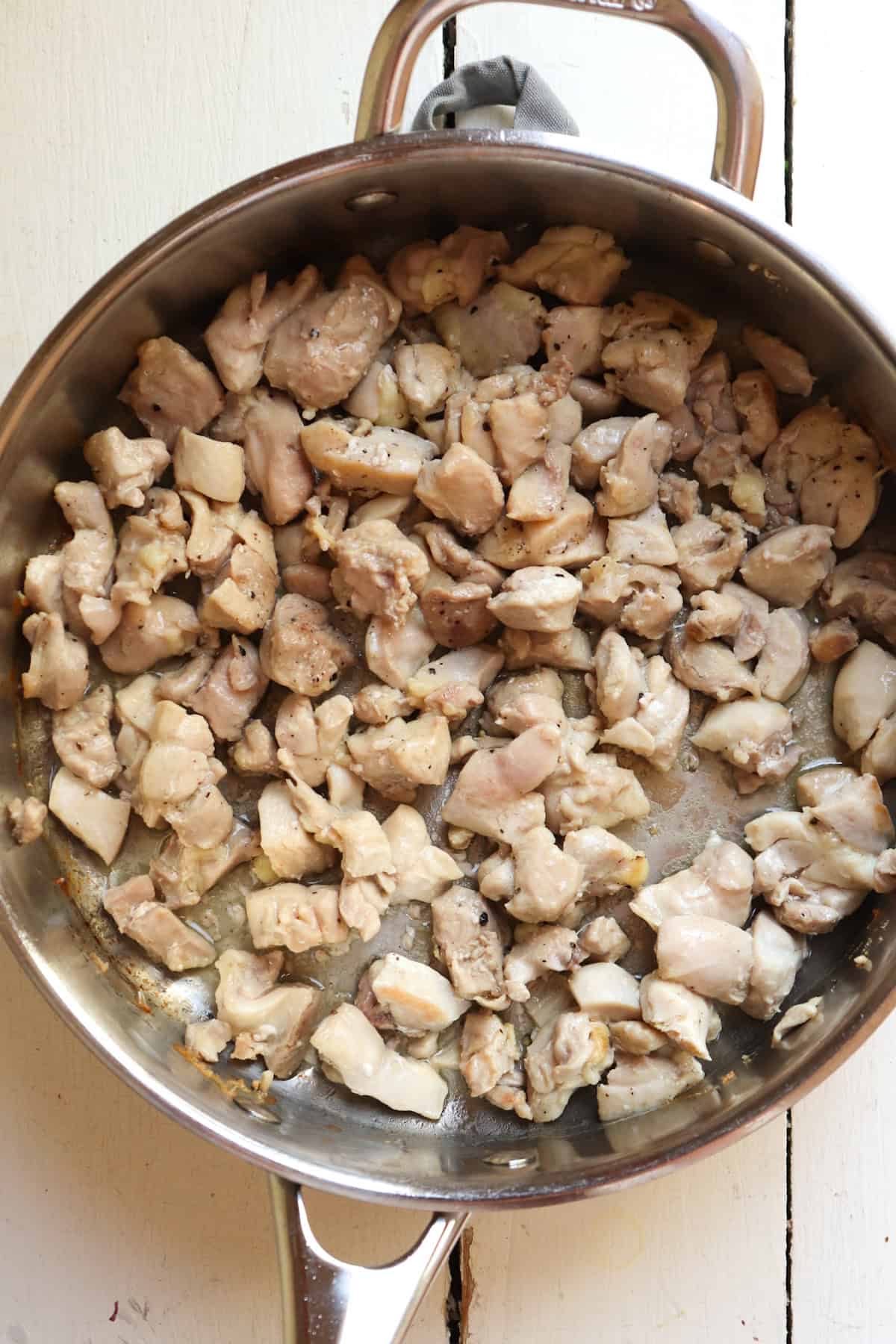 - Begin by preparing your chicken. Cut it into bite-sized pieces (about 1 inch). Season liberally with salt and pepper and set to the side.