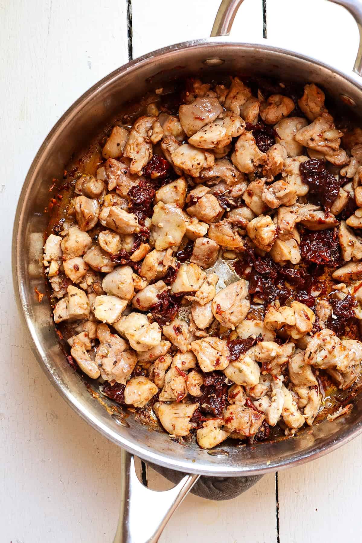 Step 3. To the same pan, add chopped sundried tomatoes, italian seasoning, and minced garlic. Stir and cook for 1 minute, until fragrant.