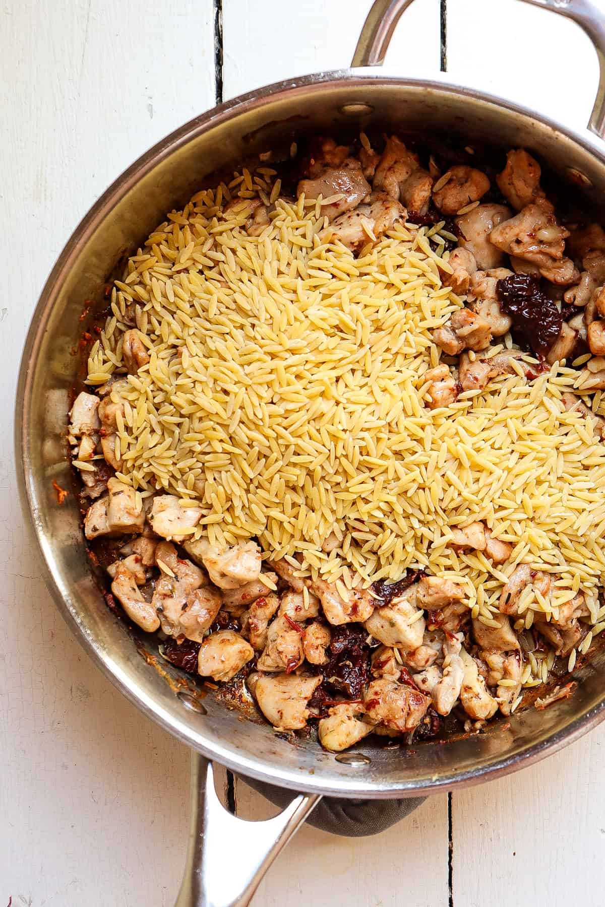 - Add dry orzo pasta and stir to coat. Cook for 1 minute. (This helps give a hint of nuttiness to the pasta, it's a delicious layer of flavor!)