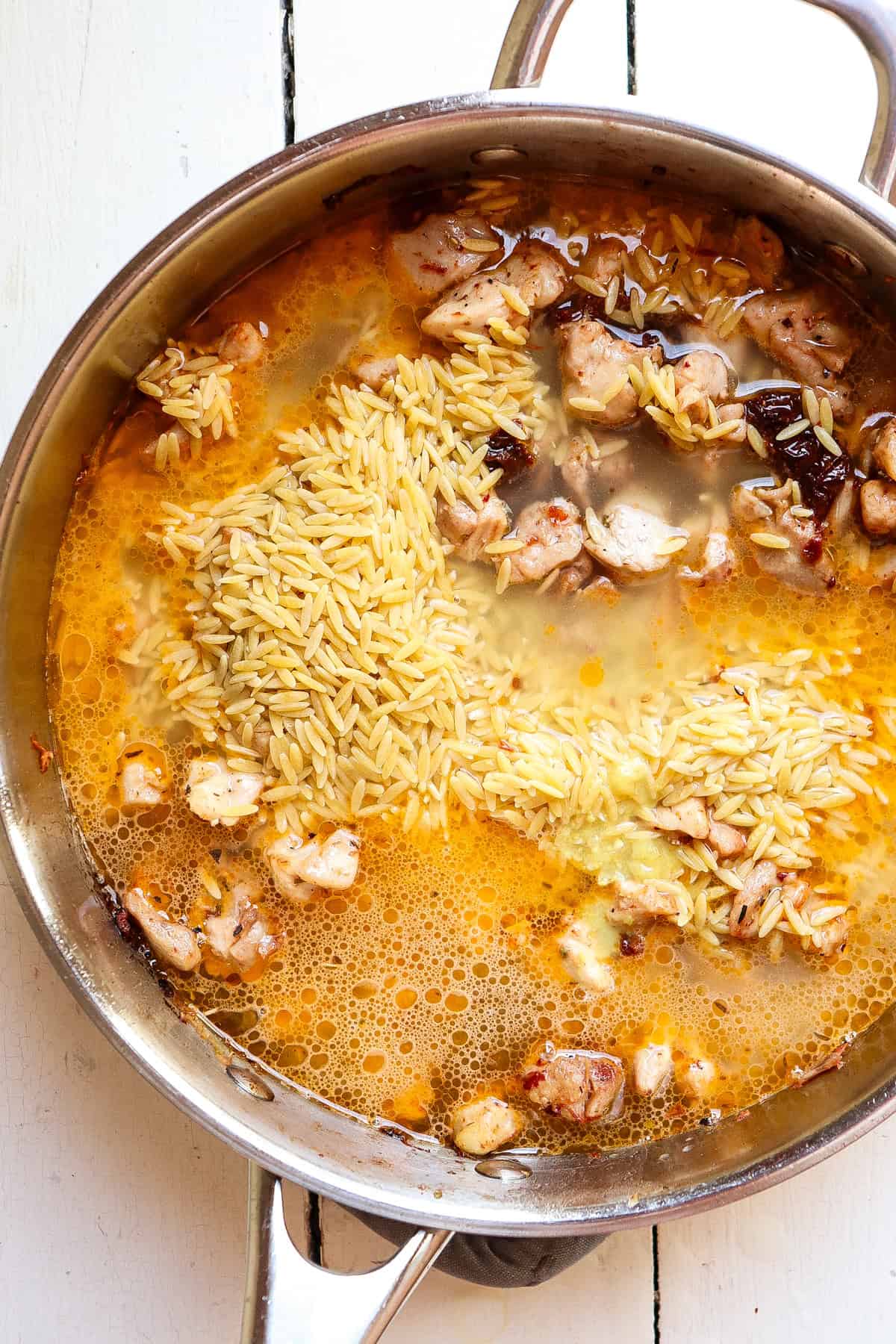 - Chicken stock: This is necessary to help the orzo pasta cook in this one pan dish.