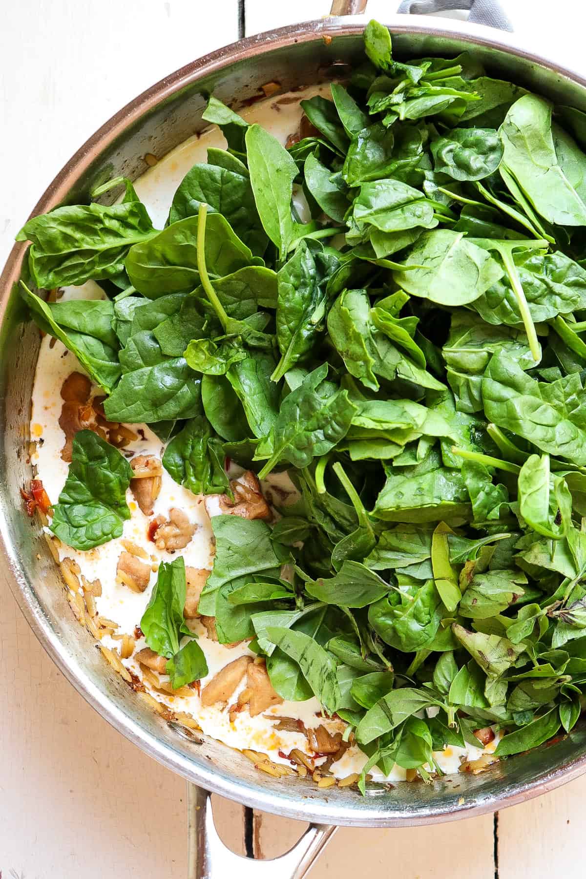 - Spinach: The spinach will look like a lot at the beginning but it cooks down so much and gets wonderfully silky.