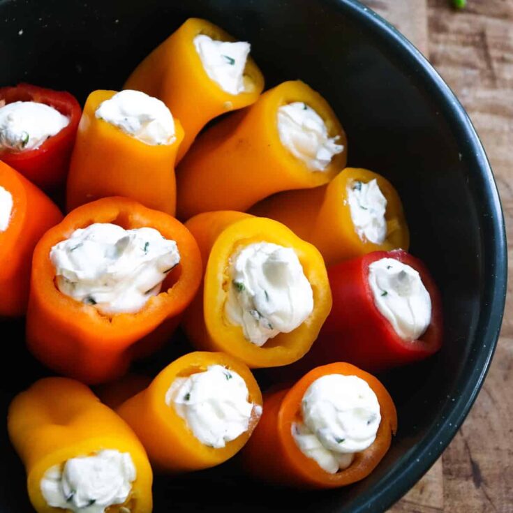 Use a pastry bag! Fill a pastry bag with your chive cream cheese filling. Cut of the tip of the bag and squeeze the filling right into each cut pepper. This saves on mess, and also makes it easier to get the filling all the way to the bottom of the peppers.