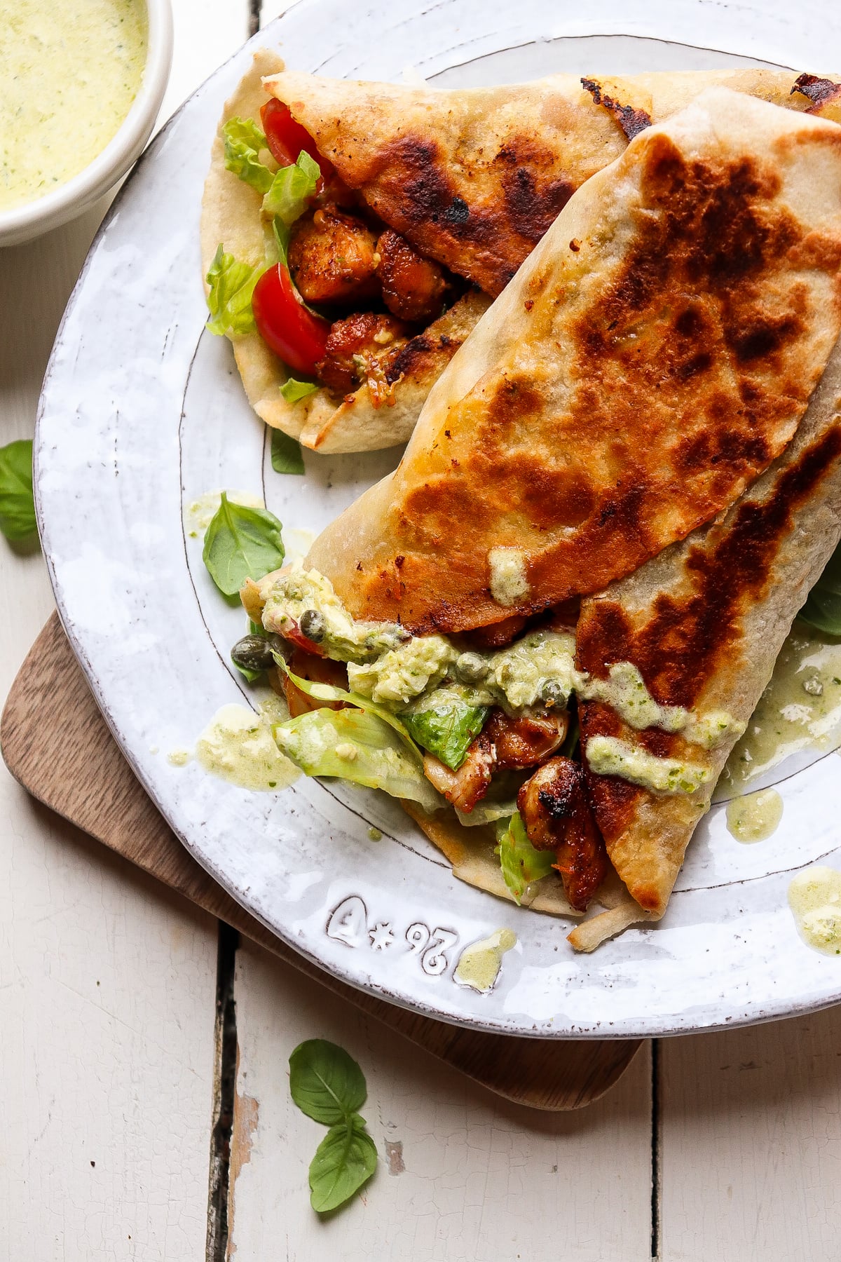 The star of the these pesto wraps is the creamy sauce. You're going to want to put this stuff on everything. It has so much flavor! Capers, parmesan cheese, lemon, garlic, pesto- all working together to create the perfect sauce to compliment the savory chicken pieces.