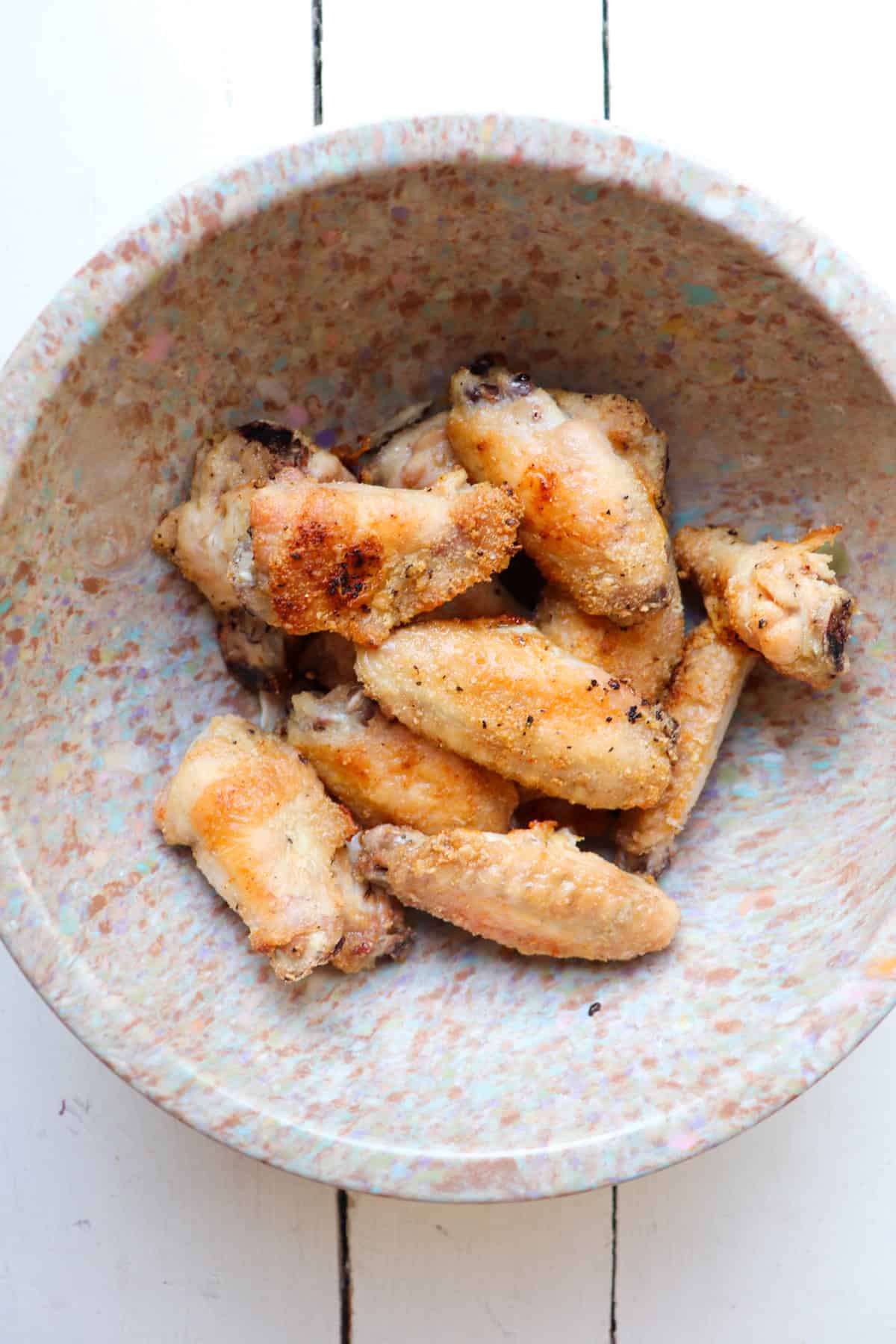 - Pat wings dry with a paper towel and place them into a large mixing bowl.