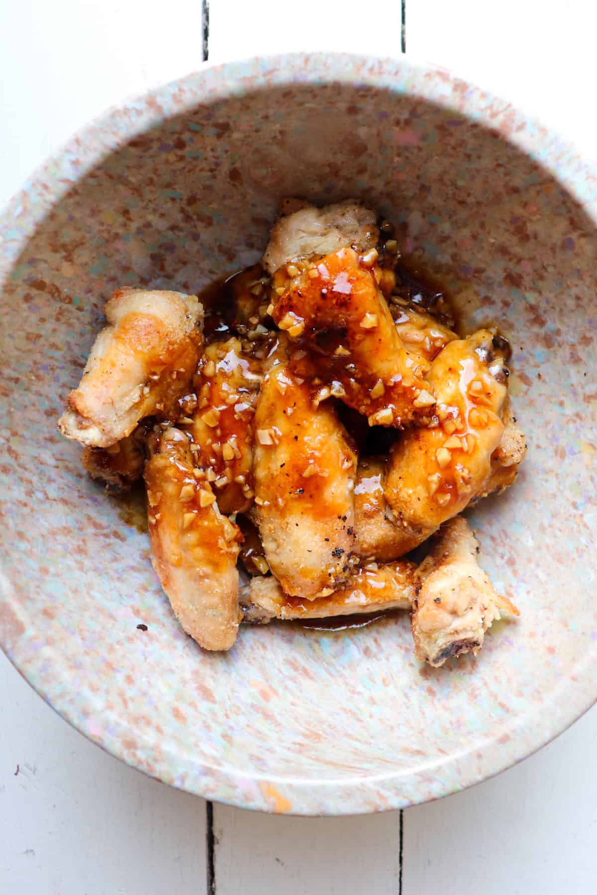 Now, if you’re craving a saucy coated wing- this one’s for you. These wings start by being baked in the oven until skin turns crispy, and the meat cooked perfectly. Then they are tossed in a delicious homemade soy sauce garlic sauce.